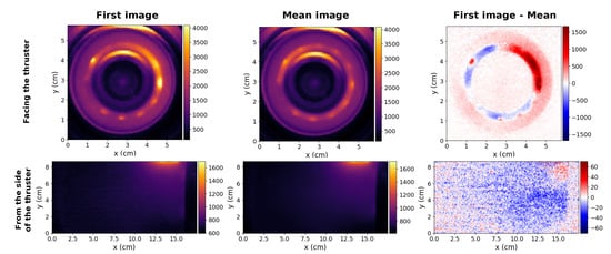 Example of images captured with the high-speed camera in front of the thruster (top row) and from the side (bottom row). For both cases, the discharge parameters are: = 20.05 Amps ( = 1.09), Q = 1.8 mg·s and = 200 V. (Left) Raw image; (Middle) mean image over the whole acquisition time interval; and (Right) raw image minus the mean image. The light intensity is given in counts, encoded between 0 and 4096 for the raw images and the mean images and between −4096 and +4096 for the raw images minus the mean images.