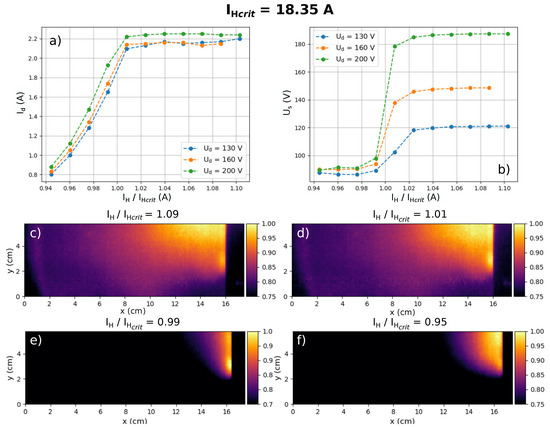 The maximum current emitted by the cathode then strongly varies with the filament temperature. This temperature is easily controllable experimentally by changing the DC heating current . In Figure 3a, the HET discharge current averaged over time is plotted against the cathode heating current. increases at first with the heating current: the discharge current is limited by the cathode emissivity. then reaches a plateau and is no longer limited by the cathode thermionic emission (which keeps increasing with ), but by the HET discharge properties. This transition, which happens at a critical heating current , is associated with a strong modification of the HET plume geometry as shown in Figure 3c–f. On these images, only the bottom 2/3 of the thruster is represented to avoid the cathode brightness disturbing the plume shape. In the case of low heating current and low cathode electron emission (), the HET plume is very small and forms a hemisphere of plasma at the exit of the channel. In the case of higher heating current and higher electron emissivity (), the HET plume is more elongated and pointy and the plasma extends further away from the thruster channel. This second case tends to correspond to typical HET plume and will be called nominal regime, whereas the first case will be called under-emissive regime. Gransted [58] described an effect of the heating current of a filament cathode on the divergence angle of a HET plume but to our knowledge no study currently reports the regime transition described here.