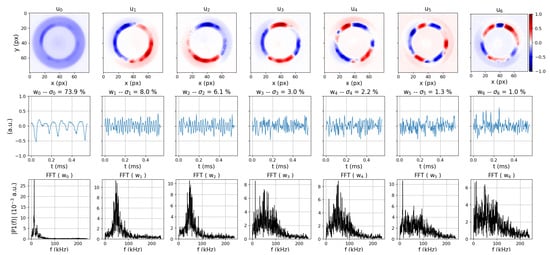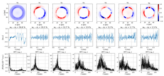 Under-emissive regime: POD analysis of the front videos with a discharge voltage = 200 V, a mass flow rate Q = 1.8 mg·s, a cathode heating current = 17.50 A ( = 0.95) and a acquisition frequency of = 480 kfps. (Top) Spatial POD modes ; (Middle) corresponding temporal POD modes with their singular value given as over the sum of all the expressed as a percentage; and (Bottom) corresponding FFT.