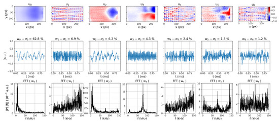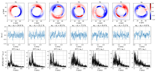 Under-emissive regime: POD analysis of the side videos with a discharge voltage = 200 V, a mass flow rate Q = 1.8 mg·s, a cathode heating current = 17.50 A ( = 0.95) and a acquisition frequency of = 300 kfps. (Top) Spatial POD modes ; (Middle) corresponding temporal POD modes with their singular value given as over the sum of all the expressed as a percentage; and (Bottom) corresponding FFT.