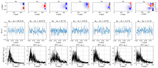 Nominal regime: POD analysis of the side videos with a discharge voltage = 200 V, a mass flow rate Q = 1.8 mg·s, a cathode current = 20.05 A ( = 1.09) and a acquisition frequency of = 300 kfps. (Top) Spatial POD modes ; (Middle) corresponding temporal POD modes with their singular value given as over the sum of all the expressed as a percentage; and (Bottom) corresponding FFT.