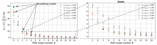 Evolution of the relative singular values given as over the sum of all the expressed as a percentage for the 14th first POD modes and for different values of the heating current ratio / . For each value of / , the mode corresponding to the breathing mode is represented with a filled symbol.