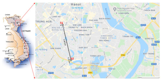 Two preschools were selected in the Hanoi capital, Vietnam (Figure 1). The climate of the region is characterized by a high level of humidity, four seasons around the year. Hanoi is the second largest Vietnamese city by population (8.05 million as of 2019) after Ho Chi Minh City, with a density of up to 40,300 inhabitants/km2 in the center district compared with the average figure of 2398 inhabitants/km2 for the whole city. This is causing traffic congestion in many parts of the city, and consequently, air pollution. The two preschools were selected to match two close types of environments: urban center (school 1 (S1)) and urban periphery (school 2 (S2)). The spatial distance between the two schools is about 4 km (Figure 1). The schools were also selected for the study based upon edifice characteristics such as ventilation system, internal covering including flooring, wall, and ceiling, windows structure, and building age, which are summarized in Table 1.