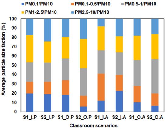 Regarding outdoors, it is noted that there were no significant differences in PM2.5 proportions in PM10 between the two periods. The accumulation mode (0.1–1 µm) accounted for a relatively large percentage of PM10, ranging from 33.4% to 54.2% (Figure 2). The accumulation mode was also impacted by children’s activities in classrooms but in a lesser extent than the case of larger particles. In the presence of children in the classroom, there were no significant differences in percentage of the 0.1–1 µm fraction between the two periods, accounting for around 33% of PM10 at S1 and S2, but they increased to 41.3% at S2 and 54% at S1 for outdoors (Figure 2). Ultrafine particles represented around 15% of PM10 at S1 and 12% at S2. However, mass proportion of these ultrafine particles in PM10 could vary from period to period during the sampling campaigns.