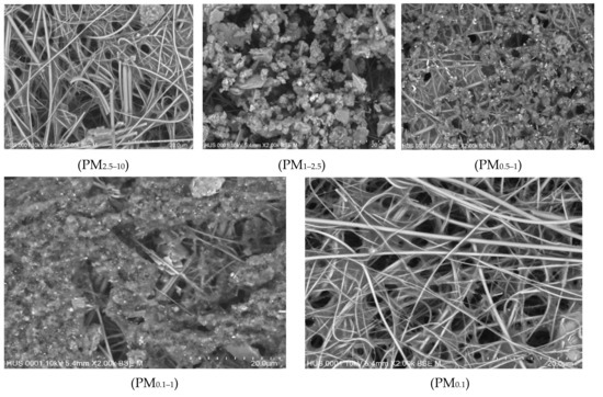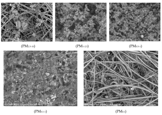 SEM images of outdoor airborne particles (PM2.5–10, PM1–2.5, PM0.5–1, PM0.1–1, and PM0.1) collected during the class at S1.