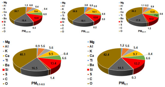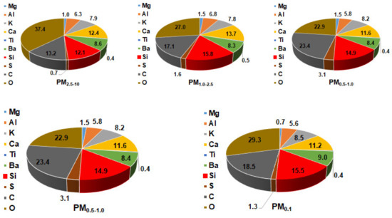 Concerning elemental concentrations, the procedure for quality assurance and quality control was applied according to our previous work [3]. In summary, all the contaminant contents of the laboratory and field filter blanks were respectively below 5% and 12% of their concentrations in the different particle fractions. The Standard Reference Materials (Urban particulate matter—NIST 1648 and Indoor dust—NIST 2584, from National Institute of Standard and Technology, Gaithersburg, MD, USA) were regularly checked to estimate the analytical reproducibility and to validate the whole procedure. Most of the analyzed elements showed very good recovery rates (from 86% to 110%), except for Si, which always presented lower than 29.5% of its mass in these Standard Reference Materials (SRMs). The quality control solutions (ICP multi-elemental standards solution VI of 10 and 100 ppm, Certipur®, Merck) were validated only when the discrepancies between the measured and the standard values were below 5%. Concentration of four elements (Ag, Pd, Pt, and V) were eliminated from the database as they were presented in the particle samples with concentrations below their detection limits (Supplementary Table S1).