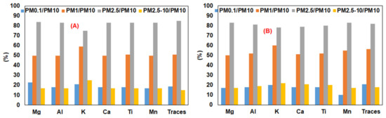 It is shown that major, minor, and trace elements in ultrafine fraction accounted for around 15%–20%, while their concentration in fine particles (PM2.5) made up a range of 75% to 80% of indoor and outdoor PM10 at S1 and S2. Major elements seemed to be slightly more enriched in coarse fraction (PM2.5–10) compared to trace elements. For instance, concentrations of Al, Ba, Ca, K, Mg, Fe, and Ti in PM2.5–10 fraction accounted for proportions ranging from 25% to 50% of their contents in indoor PM10 at S2, while those figures for trace elements (As, Bi, Cd, Cu, La, Mo, Ni, Rb, Sb, Se, Sn, Pb) were within the range of 10% to 25% (Supplementary Table S5). A similar trend was observed with the case of indoor particles at S1 and for outdoor particles at S1 and S2. Indoor activities of occupants seemed not to influence the elemental distribution in indoor particles compared to outdoor ones (Figure 7). Our results were in accordance with reported work [3,16] carried out in school environments.