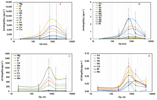 Finally, 23 elements (Mg, Al, K, Ca, Ba, Sr, Ti, Mn, Fe, Co, Ni, Cu, Zn, As, Se, Rb, Mo, Cd, Sn, Sb, La, Pb, and Bi) were selected because of their adequate results in terms of quality assurance, quality control, and their concentrations in different particle fractions above the quantification limits.