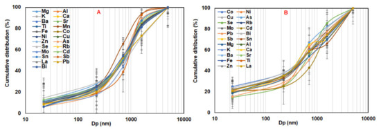 Cumulative size-resolved elemental distributions of indoor airborne particles sampled during the class at S1 (A) and S2 (B). n = 80, average ± SD.
