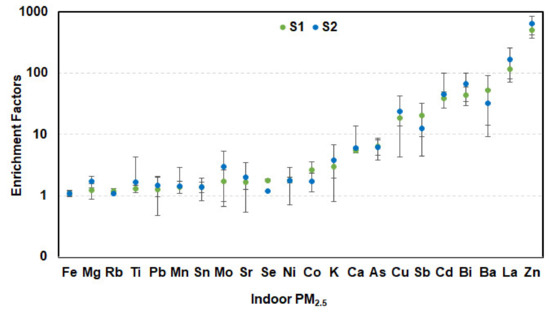 Enrichment factors (EFs) for different elements were calculated according to Equation (1). There were no significant discrepancies between EFs of indoor and outdoor particles at S1 and S2, while fine particles (PM2.5) represented most of the indoor and outdoor PM10 at the two schools. Consequently, EFs were calculated for indoor PM2.5 collected during teaching hours at S1 and S2. The error bars represent standard deviations of corresponding elements. The results obtained are presented in Figure 10. Elements with EFs < 10 are usually considered as non-enriched and associated with crustal emission sources [44,45], while those with EFs > 10 are considered to be dominated by the emission of anthropogenic sources. EFs in the range of 10–100 suggest moderately enriched elements, while EFs above 100 show significantly enriched elements in examined particles [9,44,46]. The results showed that most of examined elements (Ca, Mg, K, Fe, Mn, Sr, Ti, Rb, Mo, Sn, Se, Pb, Ni, Co, As) were non-enriched and originated from crustal sources, while Cu, Sb, Cd, Bi, and Ba were moderately enriched, and La and Zn were the most enriched by the contribution of anthropogenic emissions. Cd, Cu, Sb, Bi, Ba, and Zn could be associated to the traffic emissions [3,47,48]. Cd, Sb, and Zn could be emitted from incineration of municipal wastes [49]. The enrichment of La in PM2.5 at S1 and S2 could be attributed to thermal processes, such as power plants and the cement industry [50]. Traffic-associated elements such as Cd, Cu, Bi, and Zn [3,47,48] presented EFs values higher at S2 than at S1, confirming that traffic emission at S2 was more important. As presented previously, S2 was exposed directly to two streets and situated in close proximity (about 100 m) to the ring road N0 3, where there was dense traffic, whereas S1 was located a hundred meters from main roads and it was surrounded by several buildings and houses that might prevent traffic-originated airborne particles from penetrating into the indoors at S1.