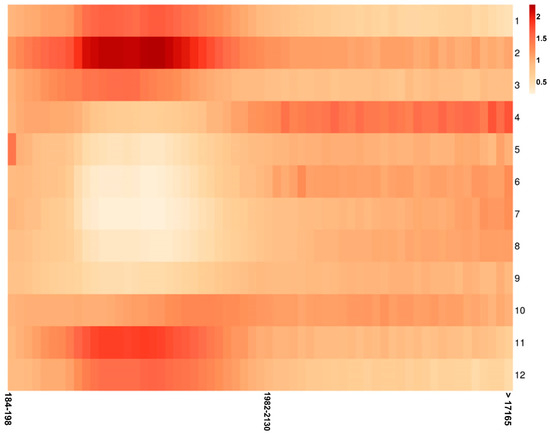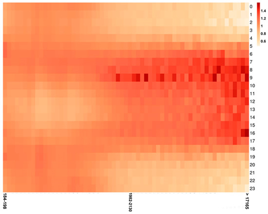 The following heatmap (Figure 2) shows the differences in variation of the individual fractions. The X-axis represents the individual size fractions, the Y-axis represents the hours of the day. Data are shown as a relative value of each hour to the overall arithmetic mean of that particular size fraction. The visualization clearly show that fractions of smaller particles have two obvious peaks correlating with traffic peaks in the morning and in the afternoon. However, larger particles (approximately >1.5 µm) show an increase during the day, where the number concentration increases during the morning peak hours and do not go down significantly until the end of the afternoon peak hour. One can also see that the number concentration drops much more significantly during the night in the case of the larger particles. One can, therefore, say that the variability is greater in case of the larger particles. While the 213–229 nm fraction only has a difference between the minimum and the maximum ratio of the individual hours of 0.17, the larger fractions have a difference of even more than 1 (9653–10,373 nm – 1.06; 15,976–17,165 nm – 1.09; >17,165 nm – 1.18).