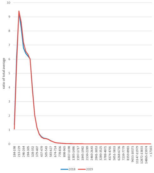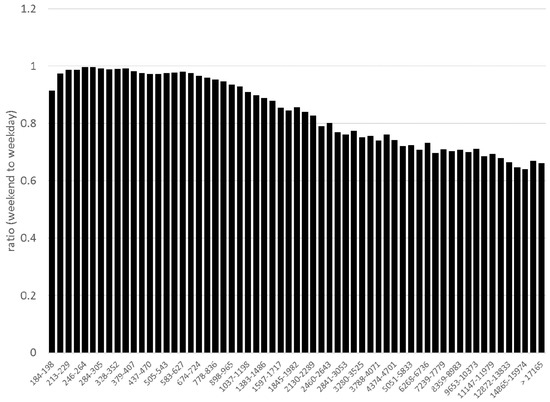 Similarly to the hourly averages, ratios between average number concentrations for weekdays (Monday-Friday) and weekends (Saturday-Sunday) have been calculated for the individual fractions (Figure 3), where the ratio corresponds to the average number concentration of that fraction on the weekend (Saturday-Sunday) divided by the average number concentration of that fraction on weekday (Monday-Friday). The graph clearly shows that the difference between weekdays and weekends is least profound in the case of the smaller fractions around 300 nm, where the ratio between average of weekday and weekend number concentration is close to 1, i.e., same values. In contrast, most significant differences were observed in case of the larger fractions, where the ratio was approximately 0.65 (smallest for 14,865–15,974 nm fraction, 0.642), i.e., the number concentration during the weekend was approximately 65% of those observed during weekdays.