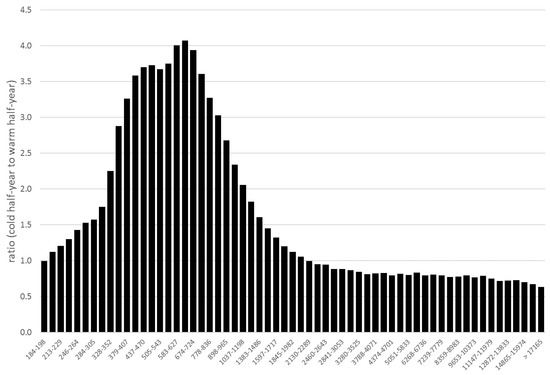 Ratio (Y-axis) between average number concentration of all the size fractions (X-axis) between the cold half-year (October–March) and warm half-year (April–September) (cold half-year/warm half-year).