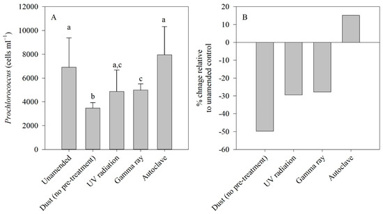 The effect of different aerosol’s sterilization approaches on Prochlorococcus abundance. (A) Changes in the abundance of Prochlorococcus following ~0.8 mg L−1 aerosol addition; (B) The net % change relative to the unamended controls. The letters above the column represents the statistical differences between treatments (Analysis of variance (ANOVA), p < 0.05, n = 3).