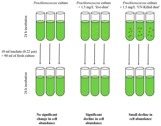 Two independent experiments of filtrate additions to Prochlorococcus cultures of axenic MED4 cells grown in Pro99 media (initial abundance of ~2 × 105 cells mL−1 in all bottles) [40] were carried out: one in April and the other in June 2017. The results presented are the average of these experiments. The aim of these experiments was to examine if and how small-scale biological agents leached from the aerosols affect Prochlorococcus MED4 abundance. To this end, the same aerosol collected in February 2015 was used and the following experimental setup was carried out (Figure 2): [1] No addition (i.e., only cultured Prochlorococcus MED4 cells); [2] 1.5 mg L−1 ‘live’ aerosol addition (containing nutrients and airborne microbes and other biological agents); and [3] 1.5 mg L−1 UV-killed aerosol addition (containing only chemical constitutes, cell and viral debris). The bottles were incubated for 24 h under low light conditions (~50 µmol quanta m−2 s−1, LI-COR LI-250A, 12:12 h dark:light) in a temperature-controlled room (20 °C). At the conclusion of the experiment, each bottle was filtered using a sterile 0.22-µm filter (Millex GV) and the filtrate (dissolved fraction which includes the <0.22-µm particles potentially including viruses and other sub-micron biological agents) was collected and transferred to a fresh Prochlorococcus MED4 culture at a 1:9 filtrate to media ratio (v:v). The bottles (containing fresh cultures + relevant filtrate) were incubated for additional 24 h under the same conditions described above. Prochlorococcus abundance was quantified using flow-cytometry at the start and conclusion of each experiment. We postulated that any response observed following the addition of the ‘live’ filtrate may be attributed to the chemical components in the aerosol filtrate (e.g., N, P), as well as biological airborne agents such as viruses, extracellular vesicles and/or small-sized bacteria (<0.22-µm). In contrast, a similar addition with the ‘UV-killed’ dust filtrate (instead of ‘live-dust’ filtrate) will only induce a response related to the chemical components of the added aerosol filtrate on Prochlorococcus MED4 abundance.