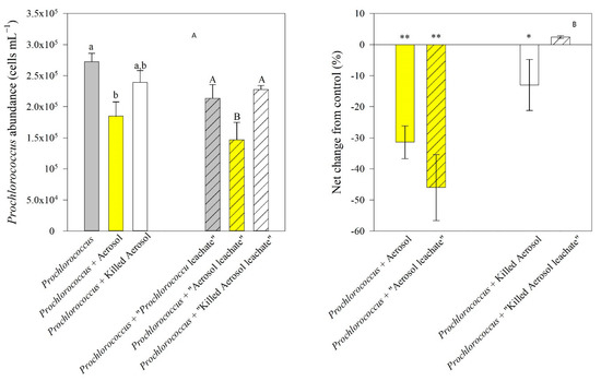 The effect of ‘live’ or ‘UV-killed’ aerosol addition on Prochlorococcus MED4 abundance. (A) Changes in the abundance of Prochlorococcus MED4 cultures following 1.5 mg L−1 aerosol addition (24 h post addition of aerosol or aerosol’s filtrate); (B) The net % change relative to the unamended controls. Striped columns represent the addition of filtered (0.22 µm) culture (‘control’, ‘live aerosol’ or ’UV-killed aerosol’) to fresh Prochlorococcus culture (10% filtrate and 90% fresh culture). The letters above the column represents the statistical differences between treatments (ANOVA, p < 0.05, n = 3–6). * p < 0.05, ** p < 0.01.