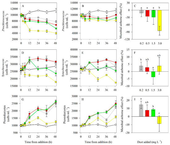 A dose-dependent response of ‘live’ or ‘UV-killed’ aerosol addition on Prochlorococcus (A–C), Synechococcus (D–F) and picoeukaryotes (G–I) abundances in samples collected in the SE Mediterranean Sea following ‘live aerosol’ (A,D,G) or ‘UV-killed aerosol’ (B,E,H) addition; and the net contribution of airborne microbes to the overall response (C,F,I). The different colors represent the concentrations of dust added to the seawater: 0.2 mg L−1 (gray), 0.5 mg L−1 (red), 1.5 mg L−1 (green), 3 mg L−1 (yellow) and no addition (white). * p < 0.05, ** p < 0.01 (n = 3).