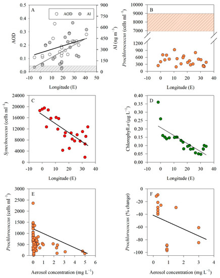 Longitudinal dispersal of Saharan dust and ultra-phytoplankton along the Mediterranean Sea. (A) Spatial distribution of Aerosol Optical Depth at 550 nm and Al concentration (compiled from [24]). The striped area represents the ‘typical’ Al background in the North and South Atlantic with no dust storm episodes [43]. The climatological global average AOD over the ocean (excluding polar regions) is ~0.12 [38]. (B) Surface (~5 m) Prochlorococcus abundance along the ship track throughout the Mediterranean Sea during April 2011 [28]. The striped area represents the ‘typical’ Prochlorococcus abundance in the surface (0–45 m) of the North and Tropical Atlantic [1]. (C) Surface (~5 m) Synechococcus abundance [28]; and (D) Surface (~5 m) chlorophyll-a biomass [28]. (E) The relationship between Prochlorococcus and aerosol dry deposition. Prochlorococcus data was compiled from [13,14,15,16,17,28,44] and this study. (F) The corresponding % change in Prochlorococcus abundance to aerosol addition (Herut et al., 2005; Chung et al., 2011 and this study). The black lines in panels A, C, D, and F show the linear relationship between variables.