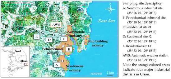 Ulsan is the largest industrial city in Korea, with a population of more than 1.2 million. As Korea’s largest industrial cluster for automotive, shipbuilding, petrochemical, and nonferrous metallic industries, the city economically accounts for 12.5% of the total industrial output of Korea []. However, the contribution of air pollutant emissions from this city has also been substantial, as much as its economic contribution. According to the Pollutant Release and Transfer Registers (PRTR) data in Korea [], the city of Ulsan was second among 17 local governments in Korea, with an annual amount of 8,211 tons of toxic chemical emissions as of 2012, which accounts for 16.1% of Korea’s emissions nationwide. Among multi-industrial activities in Ulsan, the petrochemical, oil refinement, and nonferrous metal industries are likely to be major sources of VOCs and PAHs due to the nature of their operational processes [,]. In addition, shipbuilding and car manufacturing industries are potential sources of VOCs and HMs []. Although automobile emissions are probably the most common source of HAPs in typical urban areas, industrial emissions may be a more significant contributor in a heavily industrialized city, such as Ulsan. Therefore, the adverse impacts of industrial activities on ambient levels of HAPs in nearby residential areas are a matter of great concern in Ulsan.