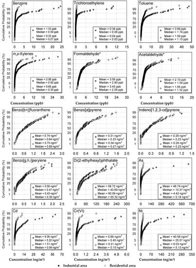 To investigate the impacts of industrial emissions on the occurrence of individual HAPs in the ambient air, all the measured HAPs data were divided into two groups: industrial (pooling the data from Sites A and B) and residential (pooling the data from Sites C, D, and E). Comparisons of cumulative probabilities of concentration data of selected HAPs in vapor and particulate phases between the two groups are shown in Figure 2. Two distinct patterns are observed. Among VOCs, benzene, TCE, toluene, and m-/p-xylenes showed much higher levels in industrial areas than in residential areas (p < 0.05), whereas no statistically significant differences were found for formaldehyde and acetaldehyde (p > 0.05). Among particulate phase HAPs, the concentrations of HMs differed significantly between industrial and residential areas (p < 0.05), while ambient levels of PAHs did not show statistically significant differences between the two groups (p > 0.05). The mean concentrations of DEHP and DBP were observed to be slightly higher in the residential areas than in the industrial areas, but there was no significant difference between them (p > 0.05). These results indicated that the major sources of high concentration VOCs and HMs were industrial emissions from both the petrochemical and nonferrous industrial complexes.