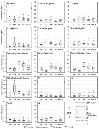 Various classes of organic and inorganic chemicals belong to the HAP category, including volatile organic compounds (VOCs), polycyclic aromatic hydrocarbons (PAHs), dioxins, pesticides, phthalates, and heavy metals (HMs) [,,]. Among them, VOCs and PAHs have received special attention because many are considered human carcinogens and are ubiquitous in the ambient air to which the general public is routinely exposed [,,,,,,]. In addition, some HAPs are bioaccumulative and persistent in the environment [,]. Therefore, long-term exposure to various HAPs, even at low ambient levels, may have adverse effects on human health and the environment due to their nonthreshold nature of toxicity as well as the combined risk caused by exposure to multiple pollutants [,,]. Depending on legal, socioeconomic, and industrial circumstances, different countries list different numbers of individual chemicals or classes of chemicals as HAPs; e.g., the USA lists 187 air toxics []; Japan, 248 []; and Korea, 35.