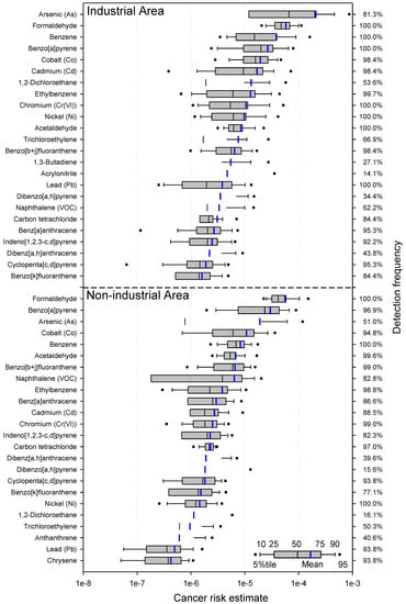 The cancer risk for an individual HAP was estimated by multiplying the ambient average concentration of the compound by its corresponding IUR. The IUR is defined as the upper-bound excess lifetime cancer risk estimated to result from continuous exposure to an agent at a concentration of 1 μg/m3 in air []. The USEPA generally deems health risks to be significant if cancer risk exceeds the acceptable risk range of 1 × 10−6 to 1 × 10−4 []. Among more than 130 target analytes measured in this study, the IUR data were available for 50 HAPs (Tables S1 and S2). Consequently, only 35 HAPs were included in the risk assessment, excluding HAPs with lower DF (<20%). The distributions of cancer risk estimates for the top 25 contributors in industrial and nonindustrial (residential) areas are presented in Figure 4, where the panels were arranged by rank according to mean values. The point estimates of cancer risks for the 35 HAPs are presented in Table S4.