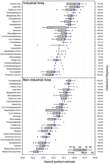 The chronic noncancer risk for a specific HAP was expressed as an HQ, which was calculated by dividing the average ambient concentration of the pollutant by its corresponding RfC. The chronic RfC is the concentration of a pollutant in mg/m3 below which long-term exposure to the general population is not expected to result in adverse effects []. Therefore, an HQ of less than or equal to 1 indicates that adverse effects are not likely to occur, and the hazard from exposure is considered to be negligible. The RfC values were available for only 65 species (Tables S1 and S2). Among them, 20 species (DF < 20%) were not included in the risk calculation. Results of the HQ calculations for the remaining 45 substances are presented in Table S5, and the distributions of noncancer risk estimates for the top 25 HAPs are presented in Figure 5. The sums of HQs, i.e., Hazard Index (HI), for the 45 HAPs were 10.0 and 2.4 in industrial and nonindustrial areas, respectively. However, it is not yet clear whether all 45 HAPs will have impacts on the same target organ or organ systems. So little is known about the interactions of multipollutants and the health risks posed by cumulative HAP exposures. Synergistic or antagonistic interactions among pollutants may enhance or mitigate risks in a way that could not be identified in this study. Nevertheless, such high HI values clearly indicate that a large proportion of the residents of Ulsan have experienced concurrent HAP exposures that may pose noncancer risks for various endpoints.