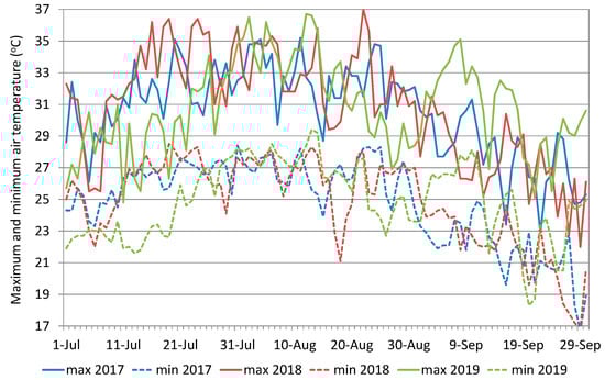 Daily maximum and minimum air temperature in Kobe city, from July to August, 2017 to 2019.