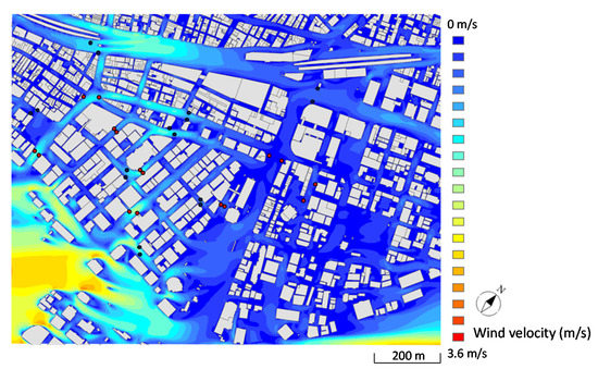 Calculation result of wind velocity distribution at 1.5 m height in analysis area. Red circles (16 pairs) indicate measurement points.