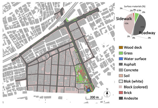 Building shape and land cover distribution in the objective area, classification of open space in the study area, area ratio of land cover materials in each study area, distribution of trees, ratio of tree canopy area in each study area, properties of land cover materials are shown in Figure 4, Figure 5, Figure 6 and Figure 7 and Table 1 and Table 2, respectively. The objective area is the economic, administrative, and cultural center of Kobe city, where people gather from inside and outside the city. Sannomiya station is located in the northeastern end and Motomachi station is located in the northwestern end of this area. The south end of this area is connected to the port area. The east-west shopping streets are located on the north side of this area, but because these pedestrian streets have arcades, they are excluded from the calculation in this study. Relatively large-scale buildings such as offices, department stores, banks, museums, hotels, city halls, and condominiums are located from the center to the south side of this area. The objective area was divided into 2 m grid, and surface materials were set for each grid. Although asphalt, block, and grass were set for the surfaces in the street canyons, wood deck, grass, water surface, asphalt, concrete, soil, block (white), block (colored), brick, andesite were set for the surfaces only in the central park (Higashi-Yuenchi). The crown width and tree height of each street tree and park tree were set by a field survey and Google Earth. Ratio of tree canopy area in the entire objective area was 9.7%, which was almost the same in the east-west road and the north-south road; it was large at 31.9% in central park and small in intersection and open space. The accuracy of the calculation result is compared with the measurement result in Section 3.3.