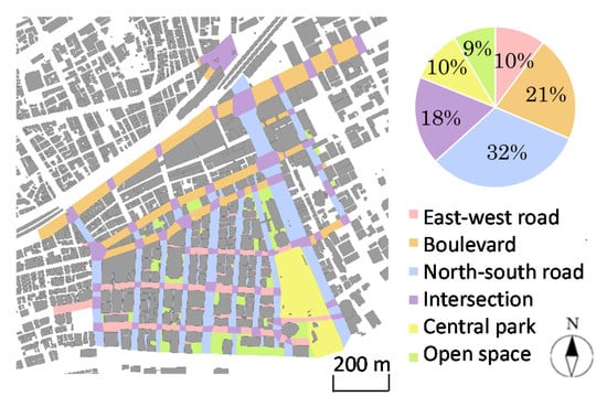 Building shape (gray—top view) and land cover distribution in the objective area.
