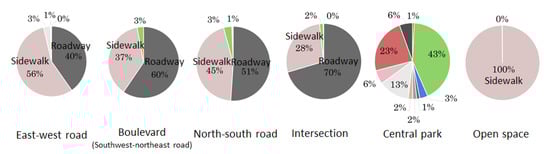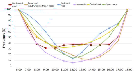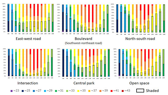 Diurnal variation of the spatial distribution frequency of SET* at 1.5 m height in each study area on 5 August 2019 is shown in Figure 12. SET* is low in shaded area since incident solar radiation is dominant on SET*. Diurnal variation of the shaded area ratio in each study area on 5 August 2019 is shown in Figure 13. Although the proportion of the shaded area is steady at 30% to 40% from 9:00 a.m. to 4:00 p.m. on the east-west road and in the central park, it becomes the minimum around noon in other areas. Even around the noon, the pedestrians may find the shaded places on the east-west road due to the southern building’s shade and in the central park due to the tree’s shade. On the other hand, pedestrians may find the shaded places on the north-south road until 10:00 a.m. and after 3:00 p.m., due to the eastern building’s shade in the morning and the western building’s shade in the afternoon. Overall, pedestrians should look for places to avoid extreme heat on the north-south road in the morning and afternoon and on the east-west road and in the central park around the noon. It is difficult to find shaded places at intersections, open spaces, and boulevards (southwest-northeast road).