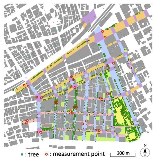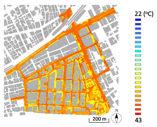 As countermeasures against extreme high temperature, it is an urgent task to design a countermeasure strategy at the street canyon level. The Japanese Ministry of the Environment developed the “Heat countermeasure guideline in the city” [3], which includes basic, specific adaptation measures and technical sections. Several studies focused on effective measures against heat waves have been implemented in various countries [4,5,6,7,8,9]. Evaporative cooling effects such as irrigation [4,5], vegetation, and pavement watering [5] have been studied by the numerical simulation. Some of those scenarios assumed the future climate affected by climate change [5,6]. Discussions including the improvement of thermal environments in the street canyon or in the plaza were not sufficiently conducted based on the evaluation of the human thermal comfort in previous examinations [7,8,9]. According to a report from Karlsruhe city [10], it is recommended that appropriate adaptation measures be introduced in “hot spots” where temperatures are high. Several typical urban districts in cities that may undergo adaptation in the future are also discussed.