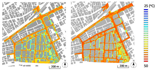 Distribution of ground surface temperature, MRT, and SET* at 1.5 m height at 1:00 p.m. on 5 August 2019 is shown in Figure 8 and Figure 9. Ground surface temperature is low in the shaded area by the surrounding buildings and trees. Since daily integral incident solar radiation is small in the shaded streets by street trees, surface temperature is low in both east-west and north-south roads. MRT is low in the median strip in some streets and the central park, where incident solar radiation and surrounding surface temperature are low. SET* is more affected by MRT than wind velocity.