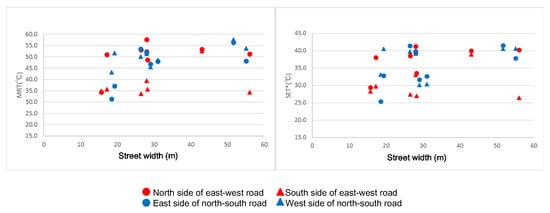 Air temperature, relative humidity, wind velocity, and surface temperature on the east-west and north-south roads with various street widths in the objective area were measured from 11:00 a.m. to 1:00 p.m. and from 3:00 p.m. to 5:00 p.m., on 29 July 7 August and 24 September 2019. Measurement points are shown in red circles in Figure 3. Altogether, 16 pairs of measurement points are set on the sidewalks on both sides of the east-west and north-south streets with different road widths. Two persons moved each measurement point during the above period and measured them after staying at each measurement point for a while. Air temperature and relative humidity were measured at 1.5 m height by a thermistor and a capacitance sensor inside a ventilation system with a shade. Wind velocity was measured by a hot-wire anemometer after confirming the wind direction by a windsock. Surface temperature on the surrounding ground and wall surfaces was measured by an infrared thermometer, which was supplemented by an infrared image by a thermal camera. A fisheye photograph was taken at each measurement point, then MRT and SET* were calculated, given the same assumptions as the above calculation methods. Measurement results of MRT and SET* at 1.5 m height around noon on 7 August 2019 are shown in Figure 10. Since the measurement results on 29 July and 7 August were almost the same, it is recognized to be the results in the typical summer sunny day in the year 2019. There are several measurement points with lower MRT and SET* on the south side of east-west road. Lower MRT and SET* are also confirmed at the measurement points where the roadside trees make shade. Shading results in lower MRT and lower SET*. There are maximum differences of about 20° in MRT and 10° in SET*, which are consistent with the tendency of the calculation results indicated later in Figures 13–15. Since it took about 2 h for mobile measurements, the spatial difference was indistinguishable from the temporal difference in air temperature and relative humidity measurement results. On the other hand, a clear difference was confirmed in the spatial distribution of MRT based on the sun shade and the surface temperature distribution. Although slight difference was also confirmed in the spatial distribution of wind velocity affected by surrounding features, the influence of the MRT was dominant for the spatial distribution of SET*.