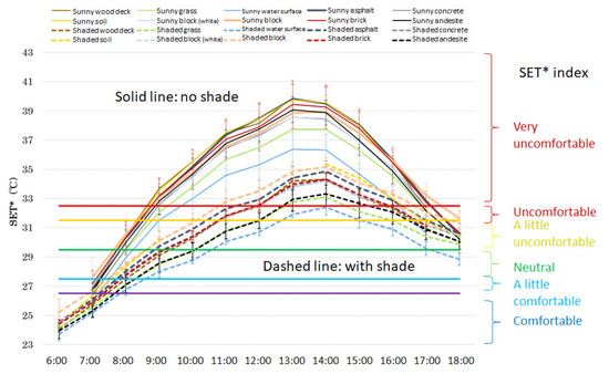 Diurnal variation of SET* at 1.5 m height on each land cover on 5 August 2019 is shown in Figure 11. The averaged value and the standard deviation are calculated for each sunny and shaded place on each cover, from the calculation results of the spatial distribution of SET*. The relationships between SET* and thermal sensation by Ishii et al. [38] are shown as horizontal lines. Based on these relationships, it is comfortable on all land covers from 6:00 a.m. to 7:00 p.m., but is very uncomfortable in the sunny place except on grass and water surface after 9:00 a.m. It is uncomfortable even in the shaded place on grass and water surface from 1:00 p.m. to 2:00 p.m. It is neutral in the shaded place on water surface at 6:00 p.m. Solar radiation shading is more effective in suppressing the rise of SET* than the difference of land cover.