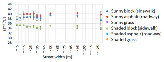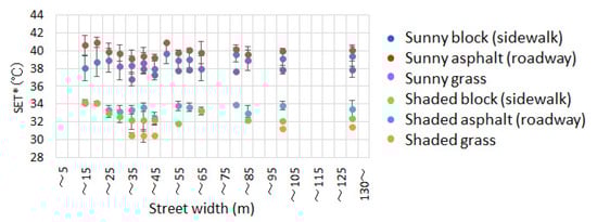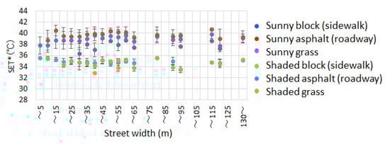 Relationship between street width and SET* at 1.5 m height at 1:00 p.m. on 5 August 2019 on boulevard (southwest-northeast road). The plot is the averaged value, and the vertical bar on each plot is the standard deviation in the street width section.