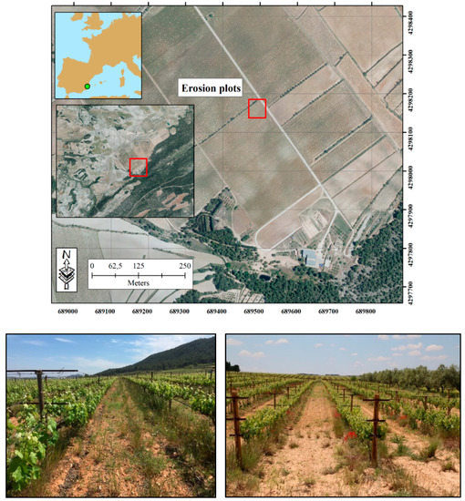 We selected a plot from the traditional viticulture region of Terres dels Alforins, in Valencia province (Valencia, eastern Spain). The experimental area is located in the Les Alcusses valley within the Moixent municipality (Figure 1). It is about 60 km from the Mediterranean Sea, elevation varying between 550 and 750 m a.s.l. The study area is a representative vineyard managed by conventional tillage on a colluvial low lying area (footslope position) with active past and current erosion processes influenced by human and natural factors [42]. The vineyards produce grapes and wine for the Celler del Roure winery using the Monastrell grape variety among others. The 30-year-old vineyards are planted with a framework system of 3.0 m × 1.4 m. All the rows and inter-rows are tilled three times per year by a tractor that tills the soil to a depth of about 25 cm, redistributing the material from the inter-row to the row area in the same upslope direction. The soil surface is devoid of vegetation cover and the soils have low organic matter content (from 1.1% to 1.5%) due to the use of herbicides. Nevertheless, during some periods of the year, some vegetation cover can be found underneath the vines. The general inclination of each inter-row area is lower than 5%. Cretaceous limestones and Tertiary marl deposits containing deep (>5 m) colluvium are the main parent materials [43], and the soils are classified as terric Anthrosol with colluvic materials [44]. The observed soil profile depths range between 40 and 60 cm and are homogeneous due to decades of tillage. The soil texture is sandy-loam and the rock fragment cover ranges from 25% to 40% but the mean volume in the soil profile is lower than 10% [45].