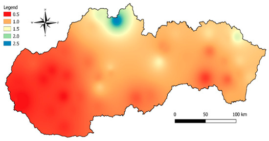 To cover the whole area of Slovakia, the meteorological data presented were interpolated and processed in a geographic information system (QGIS software) using the distance weighting interpolation function. Interpolation parameters were as follows: distance coefficient = 2, number of columns = 3000, and number of rows = 1500. The resulting map is shown in Figure 3. The red and orange parts of the map indicate places with no nitrogen leaching in 2017. The driest areas were in the lowlands (Danubian and Záhorská lowlands). In contrast, the yellow, green, and blue parts of the map show areas where nitrogen was leached (northern and central parts).