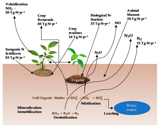 Simplified view of the nitrogen cycle in crop production. Estimated global N flows are quantified (inputs and losses, Tg·N·yr−1) [28,29].