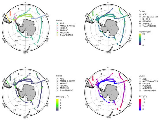 We expanded our dataset with isoprene concentration, chlorophyll-a concentration, and sea surface temperature measurements from other cruises (Table 1): AMT23 & AMT23 [15], KH-09-5 [13,40], and ANDREXII [20,41]. We averaged the data of AMT22 & AMT23 [15] and ANDREXII [41] to intervals of 6 h in order to make them comparable to ACE measurements and avoid their overrepresentation in the entire dataset. Isoprene concentrations from cruise KH-10-7 [19], the other reported cruise in the SO, were excluded from our analysis as their values were significantly higher than any other in the region, most probably due to methodological biases (Kameyama, personal communication). Overall, our dataset consists of more than 450 isoprene observations (Table A1, Figure 1a), making it the most complete ever compiled for the Southern Ocean (>40 S).