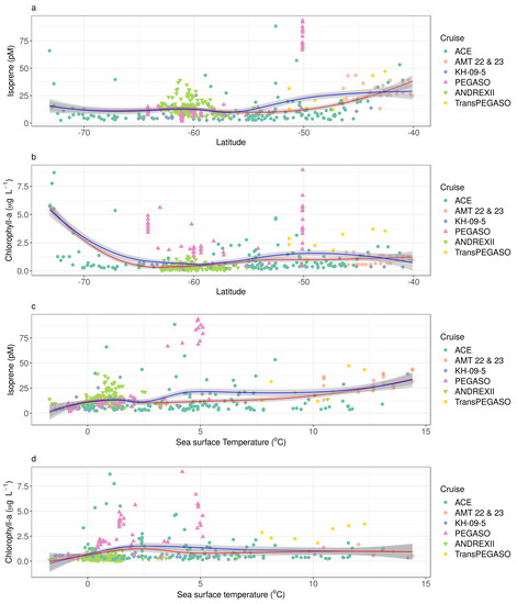 In Figure 1b, we show surface ocean isoprene concentration measurements from all cruises (see also Table A1). Overall, higher isoprene concentrations occurred in waters with high temperature (Figure 1d) and chlorophyll-a (Figure 1c). The highest concentrations (close to 100 pM) were measured during PEGASO in the phytoplankton bloom north of South Georgia Islands [22,23]. In contrast, concentrations as low as 1–2 pM occurred in waters with low chlorophyll-a content during ACE and PEGASO (Figure 1b,c and Figure 2b). Concentrations of isoprene during PEGASO show the largest variability among cruises, which is due to the sampling strategy of this cruise, which aimed at blooming waters and contrasting conditions (Table A1). The rest of the cruises showed concentrations that rarely exceeded 50 pM (Figure 1b).