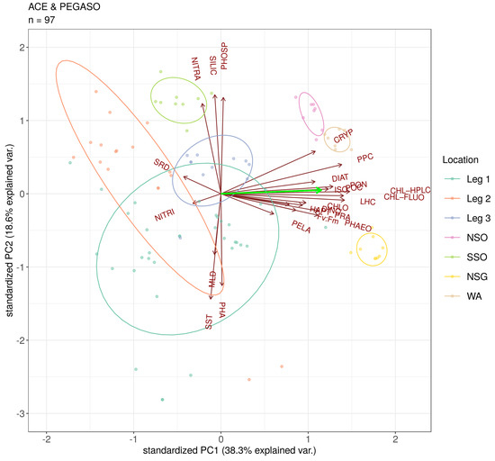 Principal Components Analysis (PCA) results for PEGASO and ACE. Abbreviations can be found in Table 1. PEGASO cruise: north of the South Orkney Islands (NSO), southeast of the South Orkney Islands (SSO), northwest of South Georgia Island (NSG), and west of Anvers Island (WA). ACE cruise: Cape Town–Hobart (Leg 1), Hobart–Punta Arenas (Leg 2), and Punta Arenas–Cape Town (Leg 3).