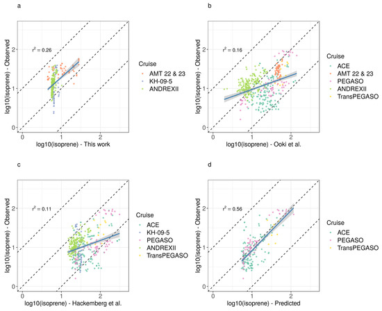 Comparison of different isoprene statistical models based on CHLA-FLUO and SST with measurements of isoprene concentration (Table A1). (a) our model (Figure A2a,b), (b) the Ooki et al. [13] model, (c) the Hackenberg et al. [15] model, and (d) our model predictions with the measurements used in its development.