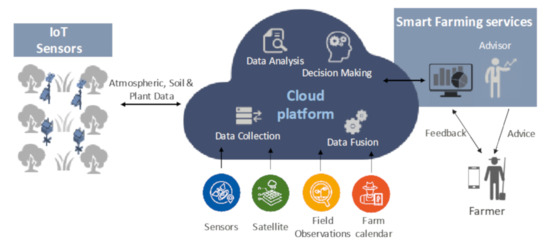 Climate Smart Agriculture (CSA), aims to enhance the capacity of the agricultural systems to support food security [9]. CSA lies on three fundamental pillars: (i) better management of resources, (ii) improvement in conservation of ecosystem and landscape, and (iii) more adequate services for farmers to ensure the implementation of the necessary changes (e.g., smart farming technologies). Smart farming [10] and the Internet of Things (IoT) in agriculture [11], also called Agriculture 4.0, utilize advances in information and communication technology (ICT) to improve farm productivity, increase quality, yield, and profitability, while reducing the environmental footprint (i.e., efficient irrigation, precise use of pesticides, etc.). It is estimated that the smart agriculture market will grow by 12.7%, annually [12]. Dorsemaine et al. [13] suggested the following definition for the IoT “a group of infrastructures interconnecting connected objects and allowing their management, data mining and the access to the data they generate.” The application of IoT in agriculture aims at empowering farmers, providing decision tools and automation technologies that integrate products, knowledge, and services for increased productivity, quality improvement, and profit [14]. These technologies enhance the use of spatial data and real-time events (e.g., deployment of smart sensors in the field, scanning the field with drones) and are, currently, the driving force for the agricultural sector’s sustainability [10,15].