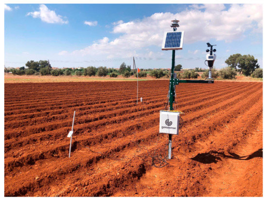 On 24 September 2019, agro-environmental equipment was installed at the pilot field (Figure 3). At the installation day, the installation team first met with the local experts (e.g., agronomists, producers/farmers) at the premises and the best possible plan for the deployment was set. In some cases, it is necessary to install the telemetric environmental sensing stations after the planting process is completed in order to avoid any disturbance due to heavy farming machinery utilized. One of the problems that the installation team faced was that at the pilot field, a wide solid bedrock existed under the depth of 45–50 cm which did not allow the installation of the soil sensor to the desired depth, allowing to measure soil properties (moisture and salinity) only at 10 to 40 cm.