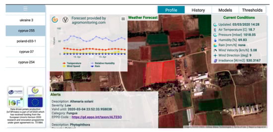 For the needs of the “Data-Driven Potato Production” pilot project, two infestation pressure models are developed aiming at addressing the risk of potato infestation by Early Blight and Late Blight diseases under Cyprus conditions. To this end, agro-climatic inputs, like temperature, leaf wetness, relative humidity, and precipitation are monitored along with observations including the plant’s phenological stages and potential pest infestation indications that allow the adaptation of the pests growth presented in [41,42] to the distinct properties of the pilot field.