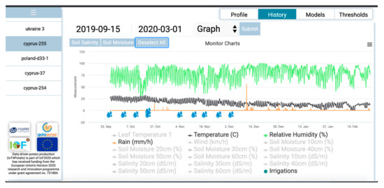 A web application was developed for the needs of the “Data-Driven Potato Production” pilot in order to support the mediation of the most important information to the end-users (farmers, advisors). Selected snapshots of the web application pages are illustrated in the following Figure 4 and Figure 5.