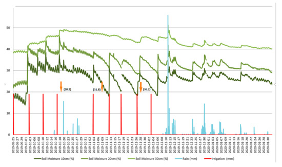 Recorded soil moisture in different depths combined with irrigation and rain events. Arrows imbedded in the figure show irrigation events (mm) and amounts according to Food and Agriculture Organization of the United Nations CropWat tool.