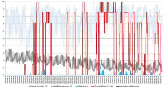 Figure 7 visualizes part of the monitored environmental parameters along with the calculated Phytophthora infestation risk. Based on this graph, there is an obvious relation of Phytophthora’s calculated risk with increased precipitation, humidity, and temperature which is apparent on the time periods of 20–23/10/2019 and 12–24/12/2019. It is noted that the farmer mentioned that usually they do not face any problems with Phytophthora during the winter crop at the region that the field is located. However, according to the farmer’s calendar Phytophthora infestations were visible on 23/12/2019. Farmer’s observations are in-line with the outcomes of the Phytophthora infestation model as the calculated risk remains at maximum levels for the period 13–25/12/2019. The farmers performed two applications of pesticides on 24/12/2019 and 31/12/2019. According to the calculated infestation risk, the first pesticide application could have been applied earlier—on 16/12/2019—increasing the efficiency of Phytophthora prevention. The second pesticide application could have been avoided once the overall temperature was tending to be below 20 °C, hence, the overall infestation risk was also limited. In addition, infestation risk for Alternaria was calculated based on the recorded agro-environmental parameters. However, no Alternaria infestations were recorded and therefore no preventive pesticide applications were performed.